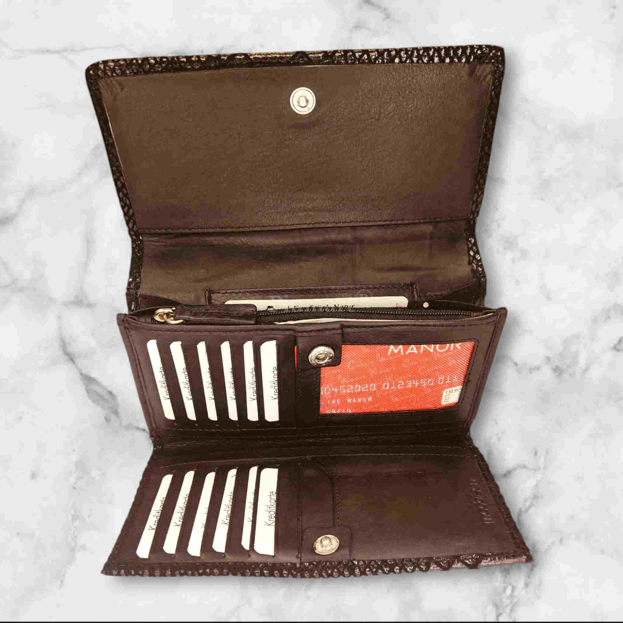 Upgrade your daily style with our Designed Leather Black Colour Purse. Made with premium quality leather, this purse not only looks stylish but also provides durability for everyday use. Perfect for ladies, its design complements any outfit. Treat yourself or someone special to this timeless and practical accessory.